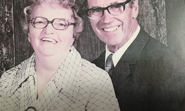 One of our neighbors, Mrs. Morris had lumbago and my mother would send me to bring her supper twice a week. In a hamper, I carried a bowl of chipped beef in gravy on toast, a piece of peach pie, and apple cider in a bottle. As I dawdled down the gravel road wearing a red cape over my gingham dress, I heard someone walking behind me and turned to see who it was, a handsome fellow.