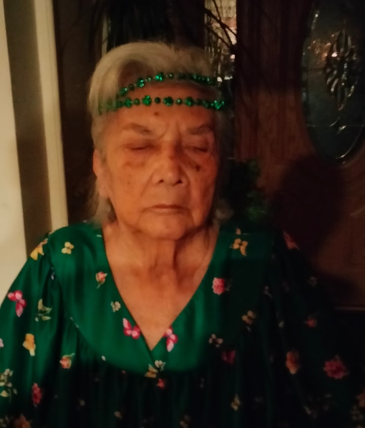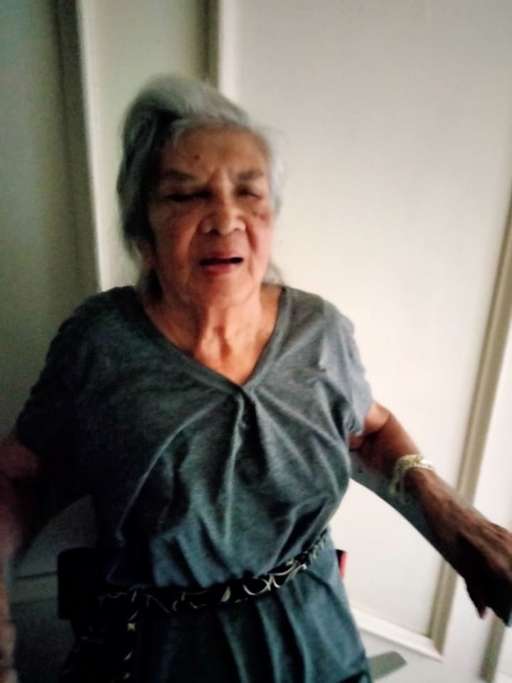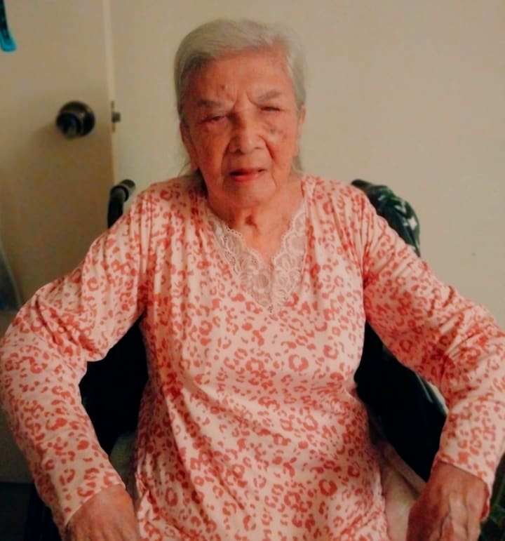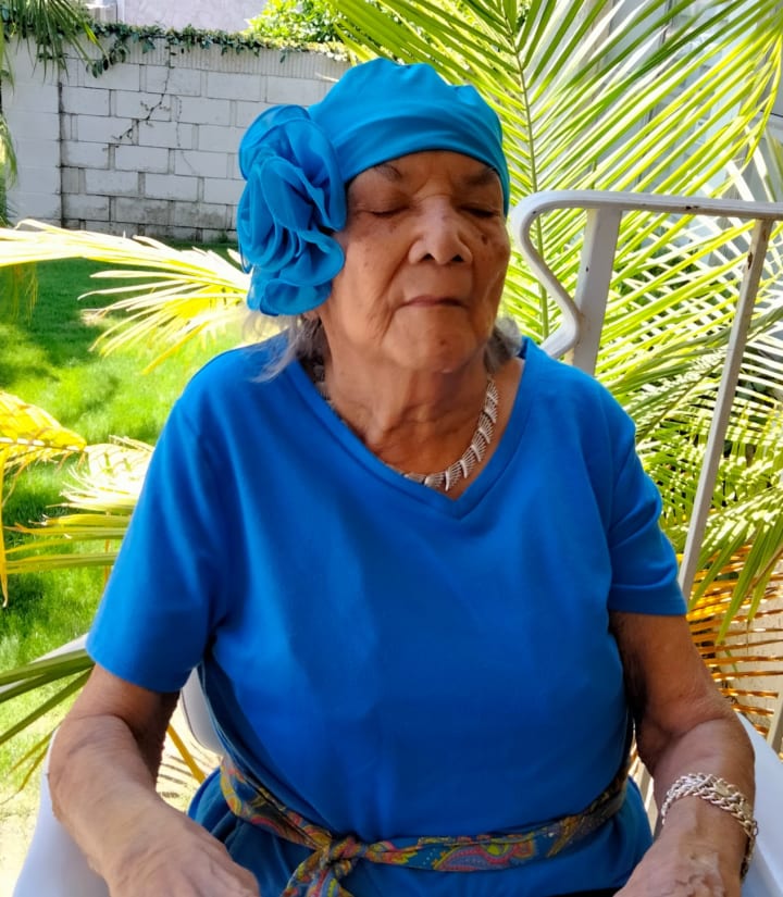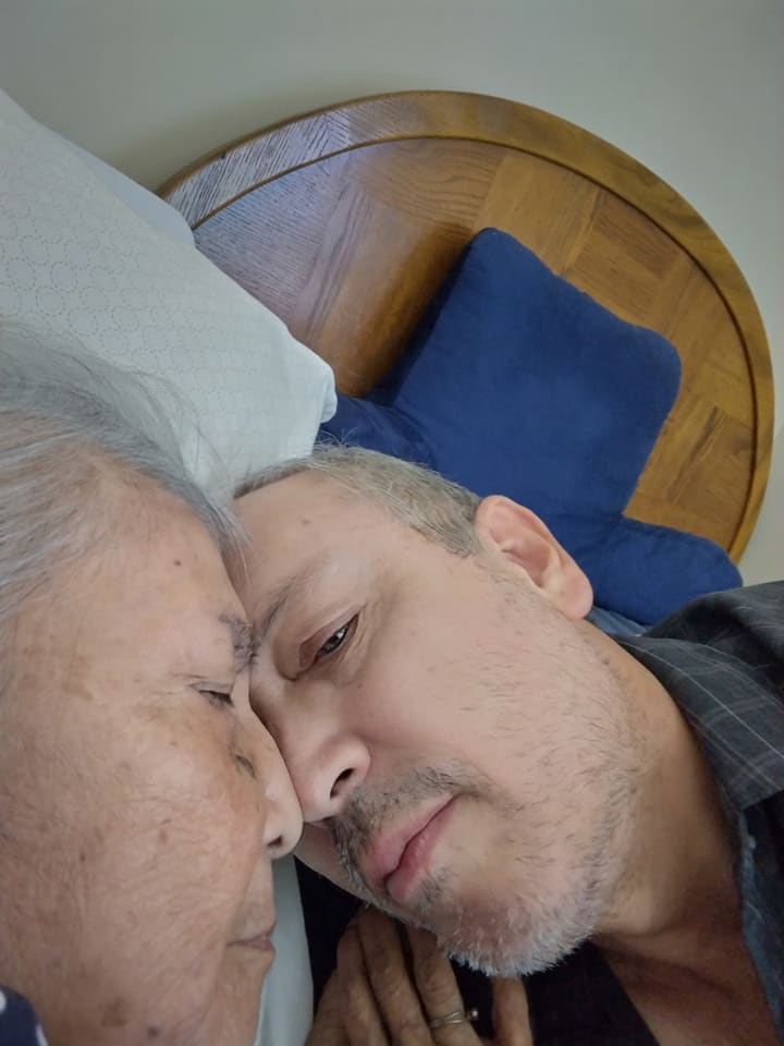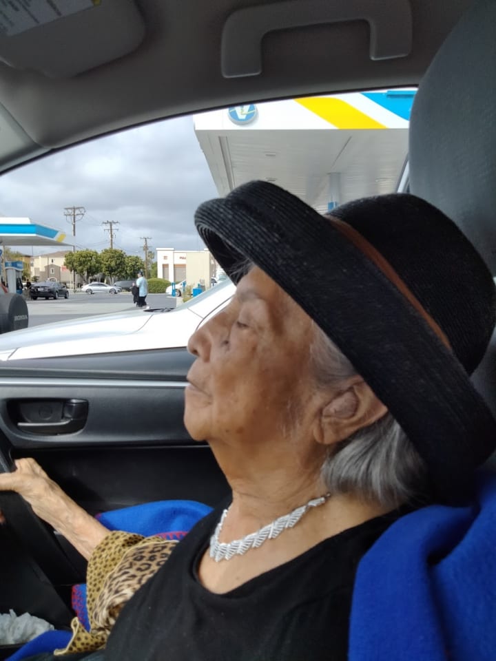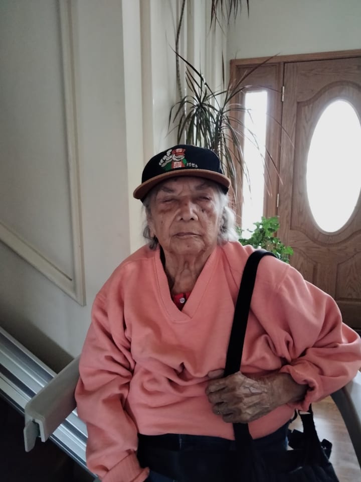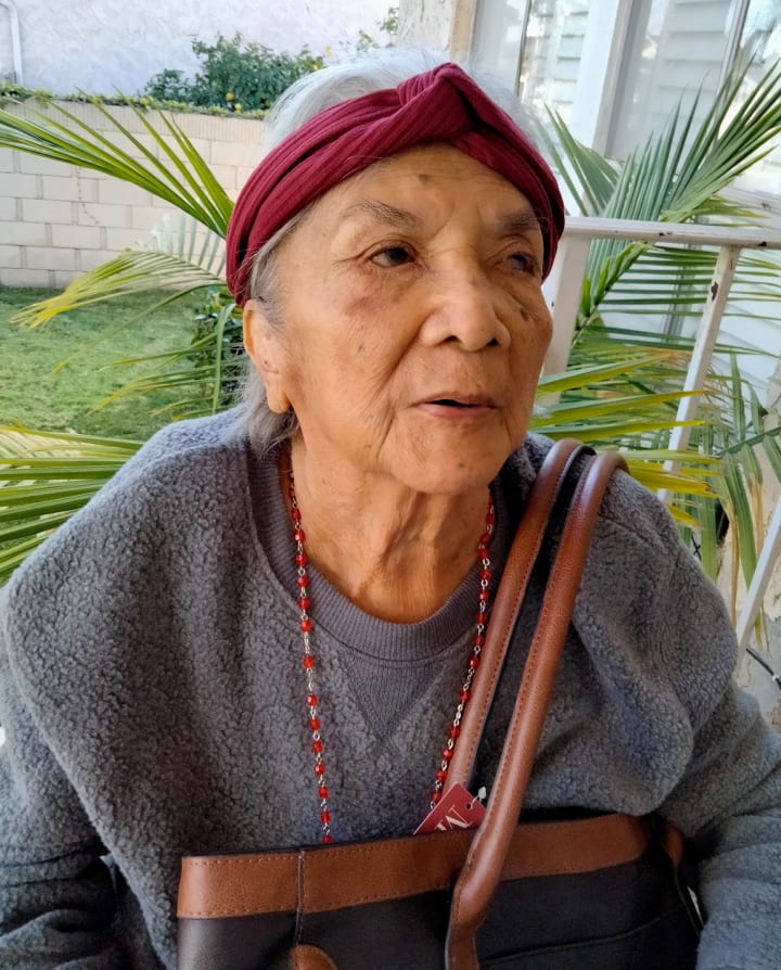 The red hairband my mom is wearing was a gift from a good friend named Roxana. This photo was taken on the front porch of our house. December 2022.