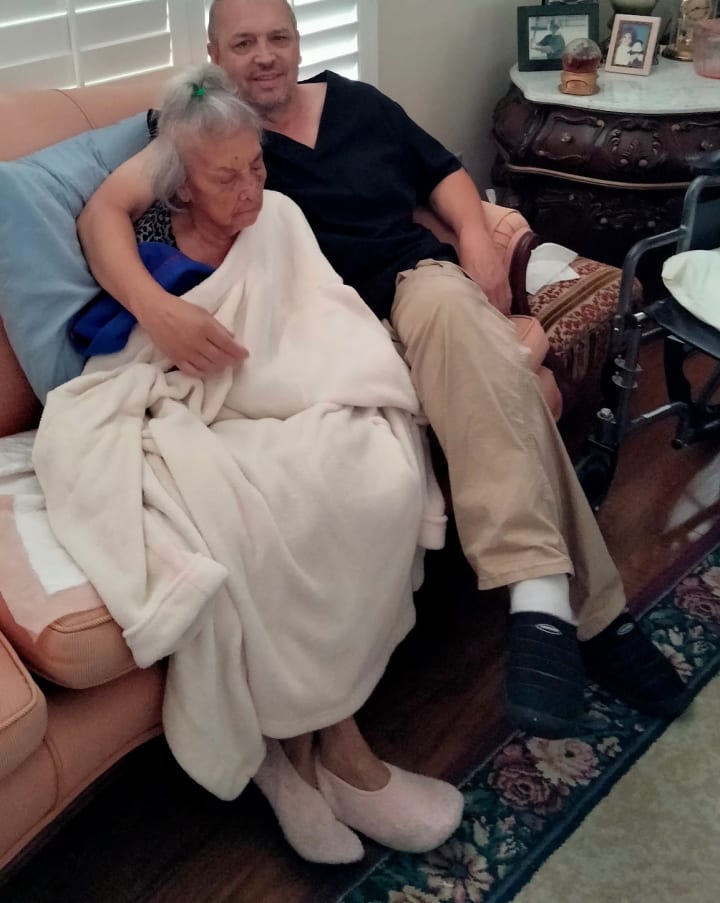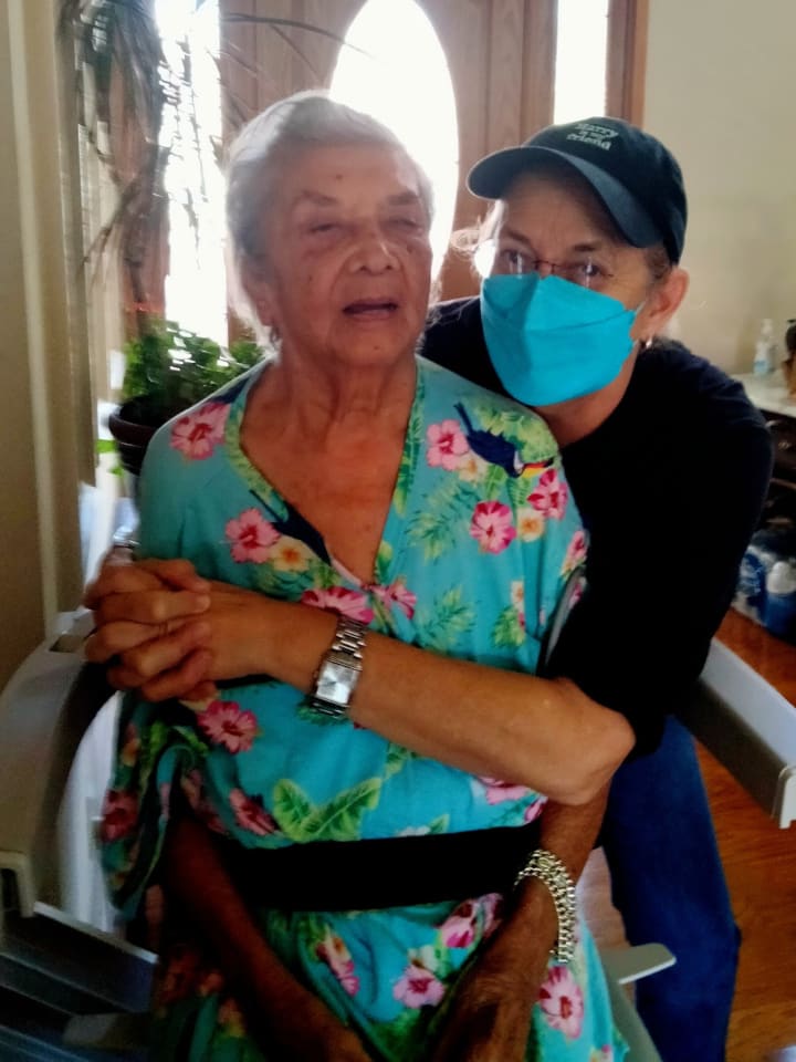 Mom with our friend Jenn Lonmon. Jenn is a rock star from South Africa. She is the lead singer with the South African band Little Sister. I will have more info on that a little later in this article. Jenn cared for my mom for six months in 2022.