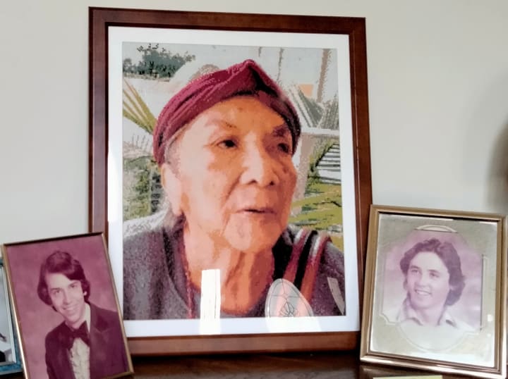 This is a portrait of a photo taken in December 2022. Our good friend Jenn Lonmon made the protrait out of beads. She said it took her quite a bit of time to do it. When she gave it to me I broke down in tears. It is such a beautiful work. Jenn is such a special friend. The photo on the left is me in 1978. The one on the right is my deceased brother Chris in 1980.
