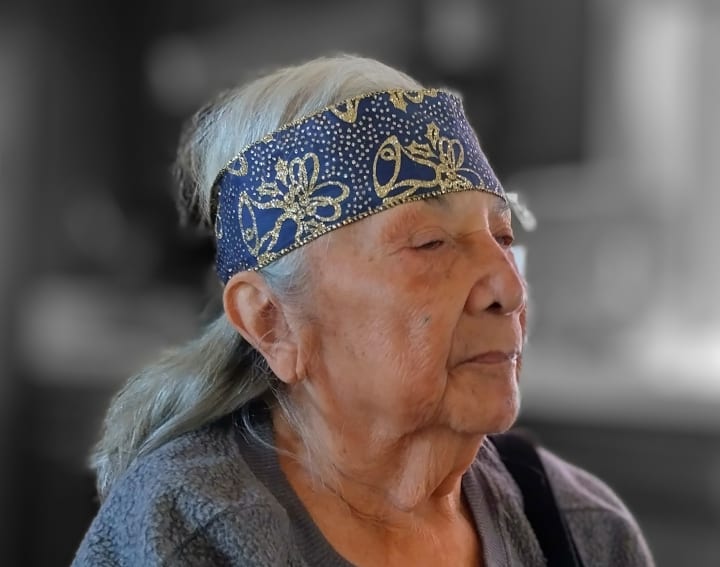 The shiny blue and gold headband is made out of gift wrapping ribbon. I try to be crafty and creative when dressing her up for an afternoon on the town. I feel this photo shows off my mom's indigeinous side quite a bit.