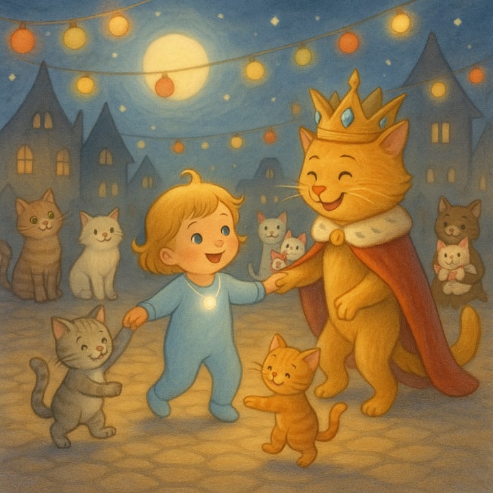 Together, they tiptoed to the window — and there it was: a city of cats dancing under lanterns, each purring a song of friendship.