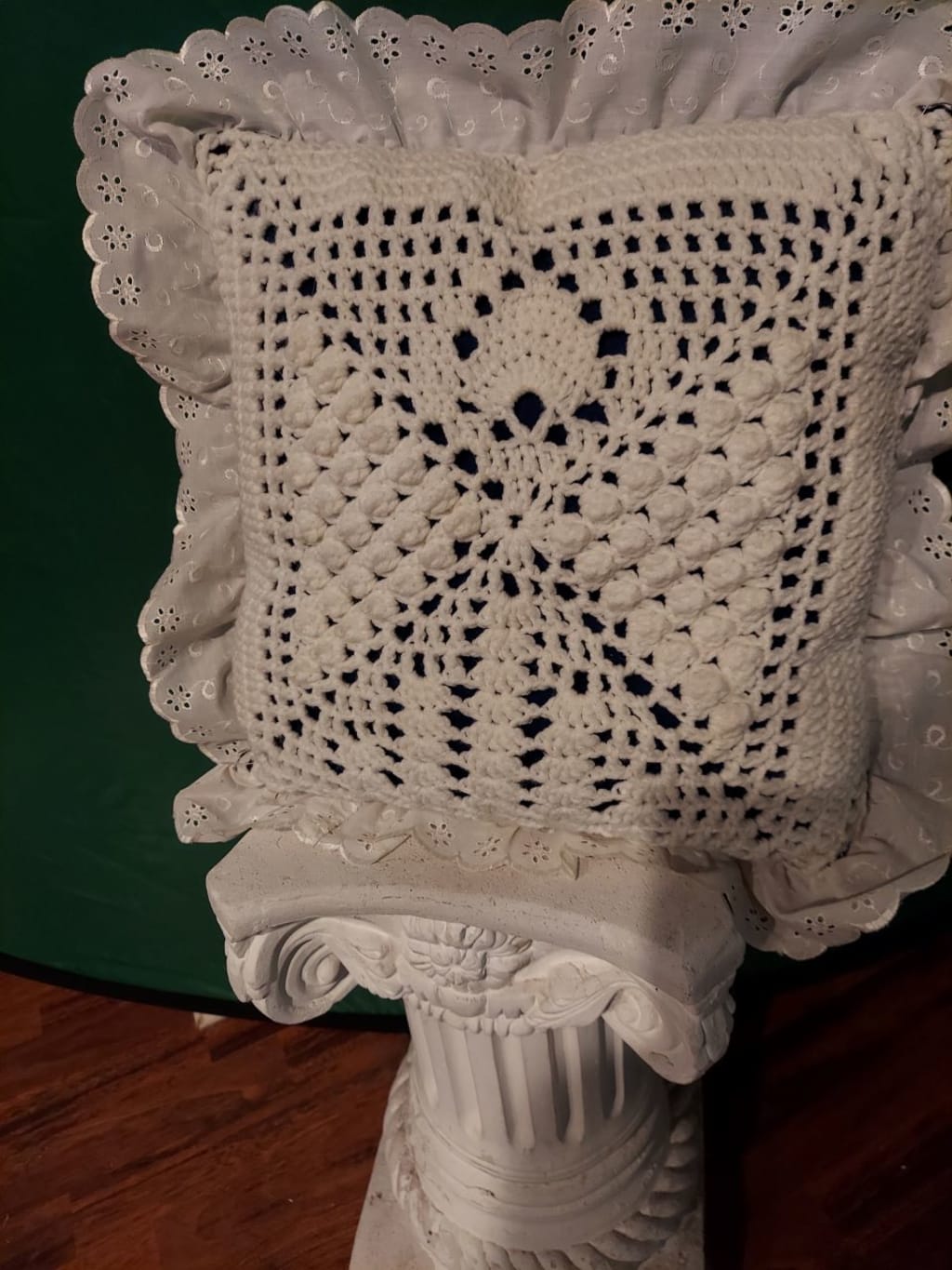 After a few weeks being back home I took this project out and looked at it with a very critical eye. Shazam! It hit me. On the corner turning there were 3 stitches misaligned. Once I saw how simple the fix was my fingers started flying around the square and the first of many angels was born. Since that first angel there has been bedspreads, lap robes, baby blankets and pillows made with this pattern. Some were plain, some embellished with beads in the wings or halo and some were stitched with metallic threads running through the stitch work. An example was a cream colored 9 block afghan with silver threads worked up for a 25th wedding anniversary as well as a white afghan with gold threads for a 50th wedding anniversary gift.