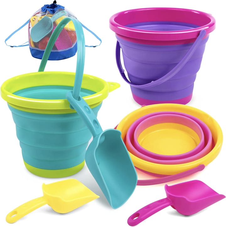 A must-have for a beach trip with kids is a set of foldable buckets with shovels. This value pack includes three collapsible beach buckets with handles, three sand shovels, and a mesh backpack for easy storage. Each bucket holds approximately 0.66 gallons, providing ample space for sandcastle building and other beach activities. These versatile buckets are made of non-toxic soft silica gel, ensuring safety for your little ones. Enjoy a great shopping experience with this complete sand play set from JOYIN and let the beach fun begin!