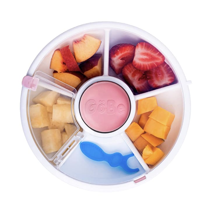 The Gobe Snack Spinner is another must-have for the beach with kids. This innovative snack container combines bowls and cups into one lightweight and user-friendly design. With five compartments and an interactive button, it makes snacking easy and fun. Each compartment holds 1/4 cups of food, allowing for portion-perfect snacking. Made from durable polypropylene, it is BPA and PVC-free for a safe feeding solution. The transparent, airtight, and leakproof lid reduces messes and makes it perfect for on-the-go use. It's easy to clean and dishwasher safe. The Gobe Snack Spinner is ideal for toddler-sized portions and helps develop fine and gross motor skills.