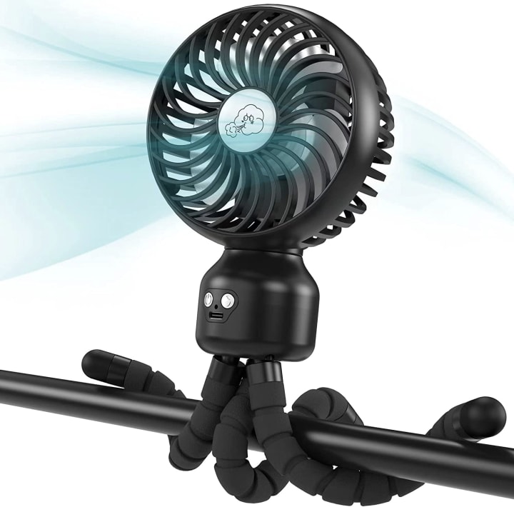 A must-have for a beach trip with kids is a durable and flexible battery-operated fan. With a stable tripod and bendable metal, it easily attaches to a baby stroller. The fan offers auto-rotation with 90° or 45° airflow direction changes and three speed settings for customized comfort. Despite being quiet, it provides a powerful breeze, similar to a car window. Rechargeable via USB, it has a 4400mAh battery for 4-20 hours of runtime. The fan's narrow grill protects baby's fingers, and the auto-oscillation feature ensures a continuous cool breeze. Stay cool and safe with this portable fan at the beach.