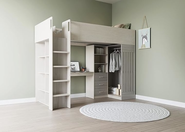The white and grey color scheme lends a neutral, contemporary aesthetic that can easily blend into various room designs and color palettes, providing a clean and polished look. Its structure is crafted with durability in mind, made from quality materials that support a stable and sturdy frame to ensure safety for users. The design also includes integrated storage shelves, making it easy to keep essentials like books, games, or décor within reach.