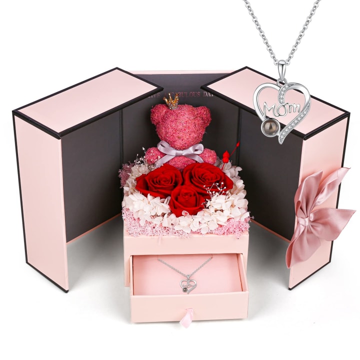The Sterling Silver Necklace with Heart and Mom Jewelry Design is a beautiful and thoughtful gift for any mother on special occasions such as Mother's Day, Birthday, Christmas, or Valentine's Day. The necklace set includes a 925 sterling silver jewelry necklace with "mom" lettering and a gift box of preserved rose. The preserved flower and moss bear that never withers represents the eternal love of a mother, making it a perfect way to show appreciation and gratitude to your mom. The heart-shaped mom letter pendant and chain of the necklace are made of delicate, durable, and never-fading sterling silver, ensuring that the necklace can be cherished for years to come. This necklace set makes the best gift for a mother who loves elegant and timeless jewelry pieces. The manufacturer offers intimate service, and if there are any questions or dissatisfaction with the preserved rose necklace set, they will communicate with you within 24 hours to ensure a 100% satisfied shopping experience.