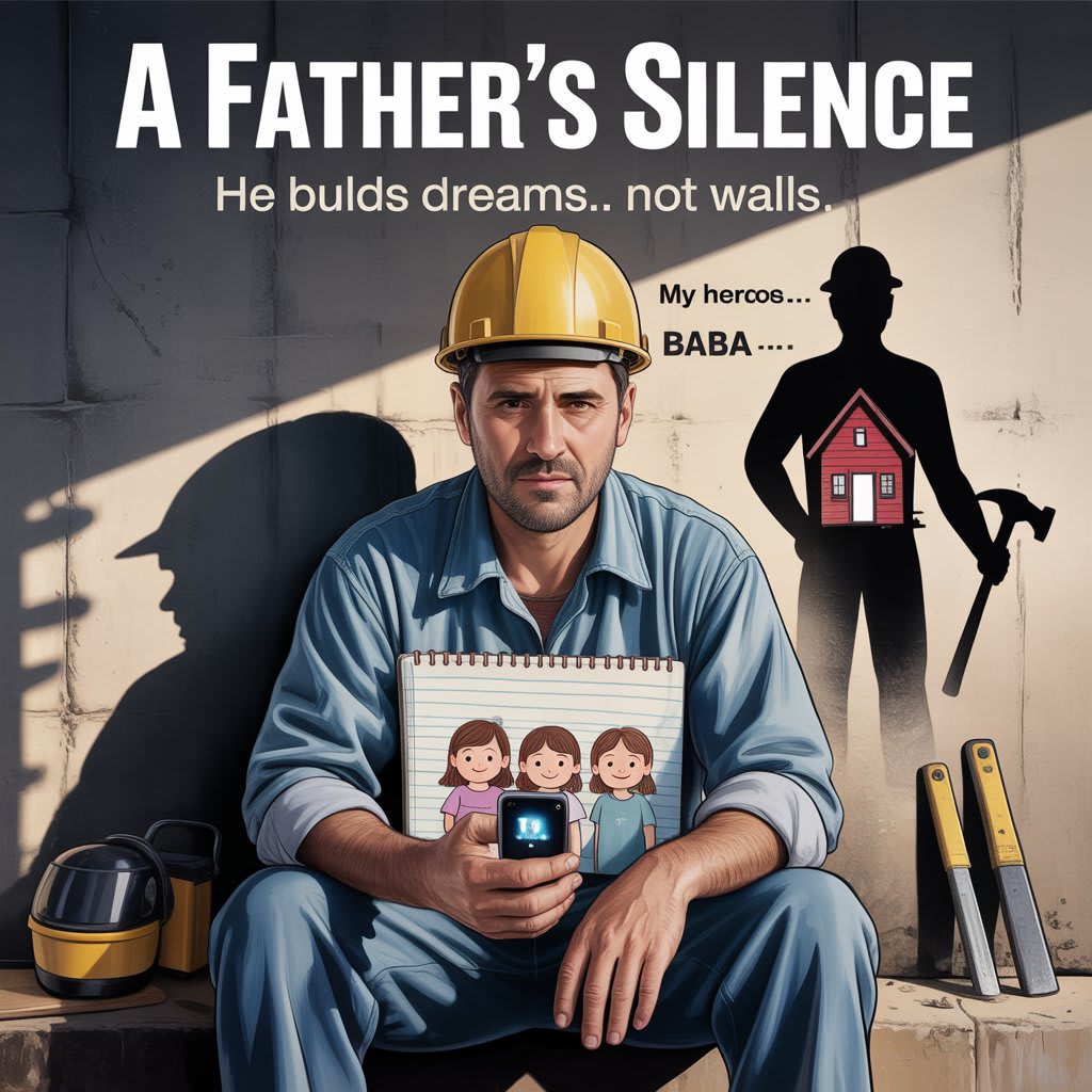 He lifts a cold steel hammer, wearing gloves torn from weeks of labor. His back aches, his stomach growls — but he smiles anyway. Because three little faces live inside his heart.