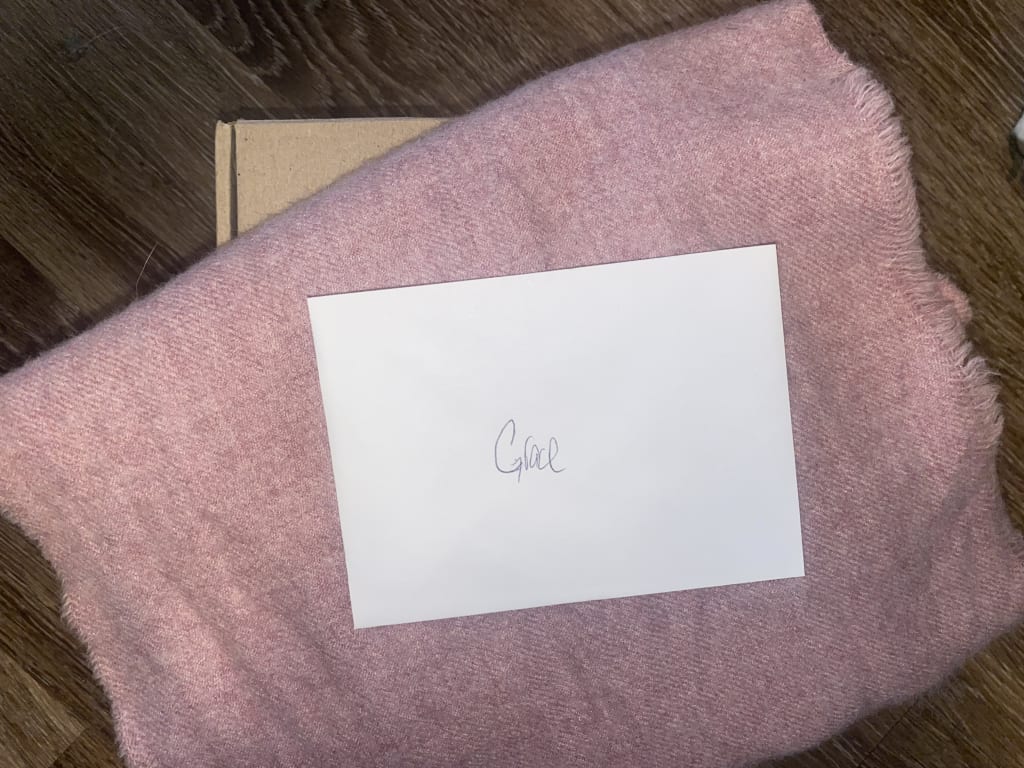 The box contains a photo album, a small jewelry box, candles, and a neatly folded scarf that sits on the top. In the middle of the scarf lay a small white envelope with my name written across it in the same scratch from the box.