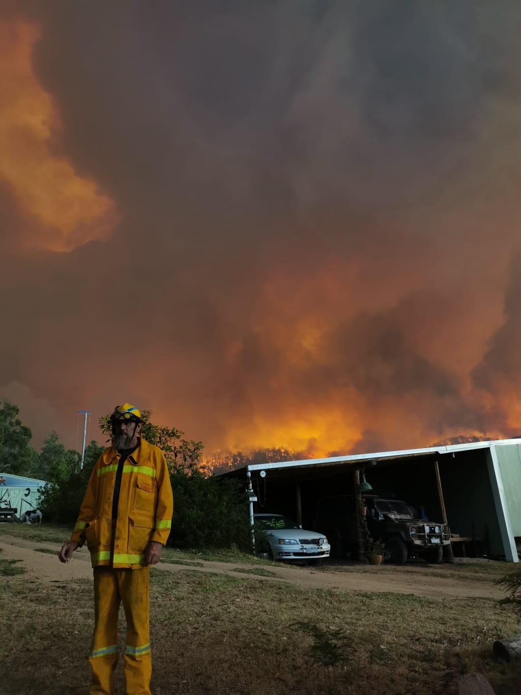 Monday, 30th December 2019. I shot this image of my Father, Shaun - 55, in his CFA uniform punching down a cigarette in almost complete serenity. This was taken probably at around 5pm, at our home in Goongerah, far East Gippsland, an hour or so before we were face to face with the flames lapping up the side of our families house. We live very remotely, and had always known the risk of doing so, especially being in the heart of the bush, and placed right on top of a hill.