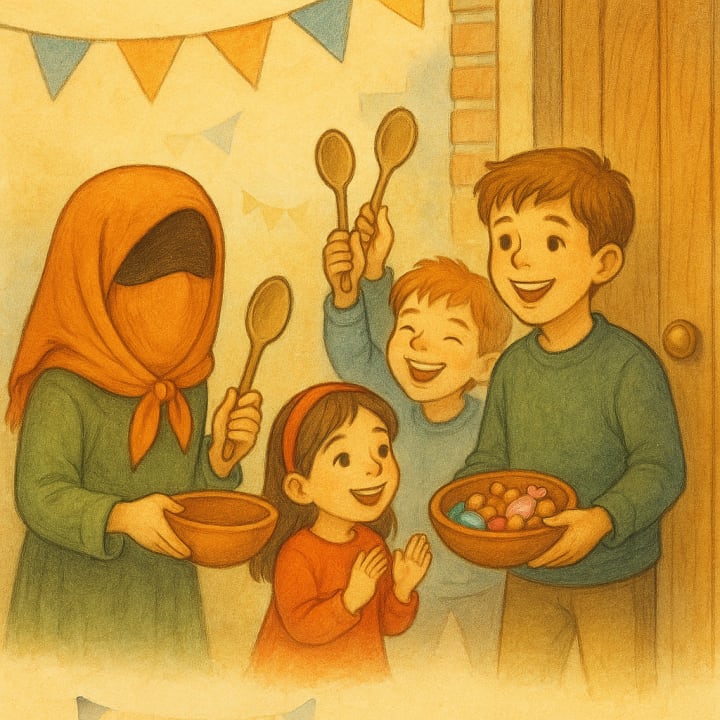“In Iran, kids also do something called ghashogh-zani — spoon knocking. They cover their faces with scarves, hold a bowl and a spoon, and knock on doors. People open the door and put nuts and candy in their bowls!”