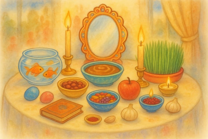 The Haft-Seen table — that mystical arrangement — holds symbols of vitality and human hopes: