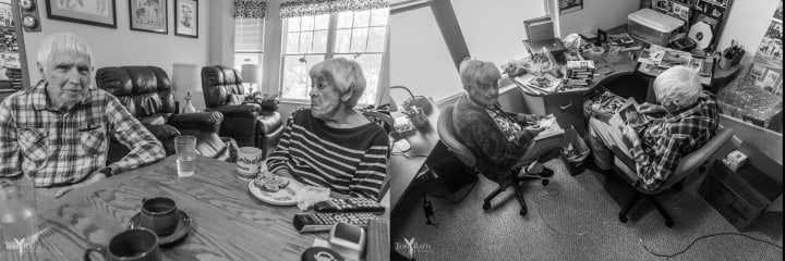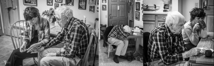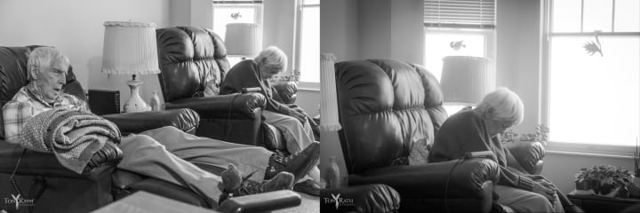 Dad sat and watched all the activity, but I am sure his brain would not register what was happening. Denying reality is sometimes a survival tactic. I am sure he could not imagine life without his wife of 73 years. They lived by routine and he did his best to keep by it. The afternoons were for naps, and to him - despite the strained breathing - Mom was peacefully dozing in her chair.