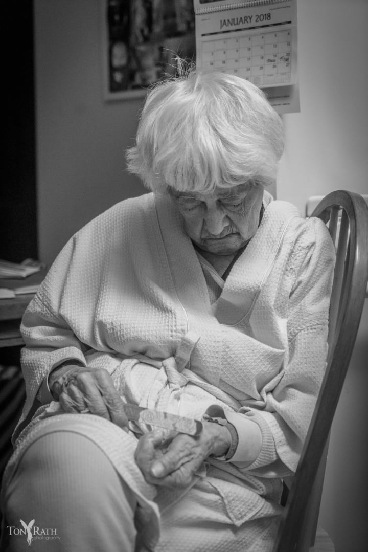 By late afternoon, all but Dad could see that Mom would make a final journey from chair to bed. While she slept, I gently lifted her in my arms and carried her to the bedroom. Nurses helped to change her wet undergarments and dress her in her favorite soft nightgown, then adjusted her to be as comfortable as possible in her bed — all without waking her. I put lip balm around her nose where the oxygen tubes were chaffing, then used a small sponge to drop moisture in her mouth.
