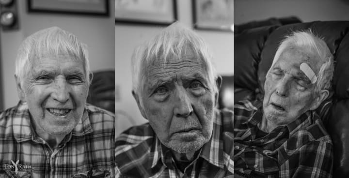 Disbelief. His hand goes to the top of his head. Then recognition of what I said. His face withers like a sped up time-lapse of a flower wilting. From somewhere comes a primal groan, almost an inhuman sound and a cry of “Oh God!” followed immediately by “She was my whole life!”. Who can know what 73 years loving the same person can do when it is taken away.