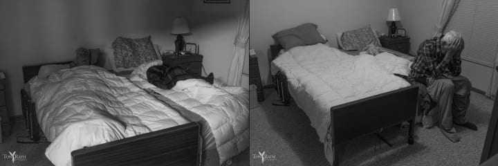 Purpose and love can mute grief. My only concern now is Dad. He wakes at 7am, and I can’t tell him. The funeral home will come for the body at 8:30am, time enough to dress him, feed him, and get him comfortable in his chair. As he dresses, he glances at Mom, but in the dim light — the shades are closed and he will not turn on the bedroom light to dress for fear of waking Mom — he does not notice she is gone.