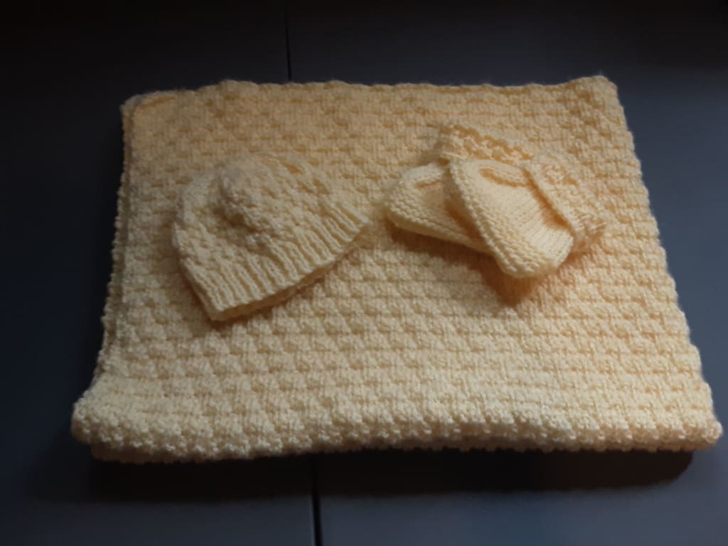 I suggested to my partner that I gift her a baby blanket, beanie and bootie set.