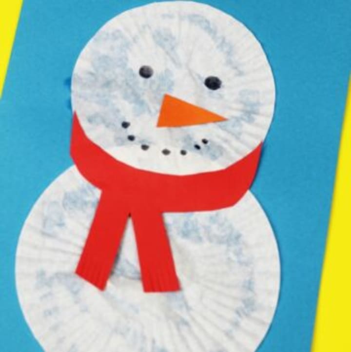 - Glue the smaller cupcake liner on to make the snowman's head.