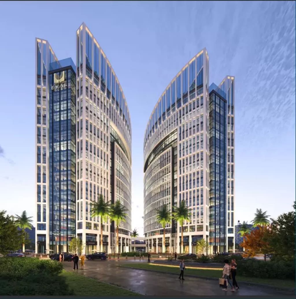 The meticulously designed Eval Towers New Capital project offers an ideal and sophisticated working environment, encompassing a spacious area of 9,100 square meters and standing tall at 80 meters, granting it a striking presence in the city.