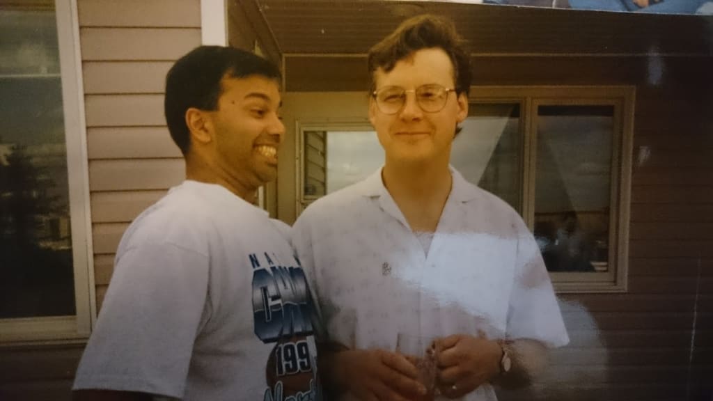 A photo from the 90's of the author's dad and her uncle (from her mom's side)