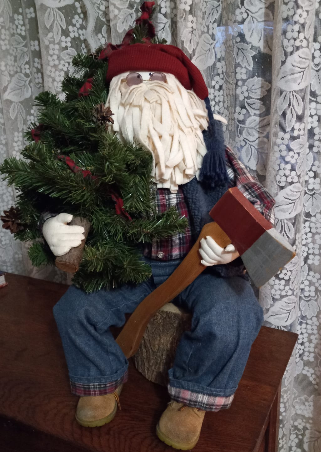 What a joy! First came pattern making for a prototype for a somewhat “traditional” Santa, designed to sit on a stairstep. I had not made my own patterns in the past, so this was a new adventure! A snip here, a tuck there, and a whole lot of stuffing! To weight him down, I used scent-free kitty litter in his bottom. Specialty and upholstery fabrics made the best coats and pants, trimmed with faux fur or fleece. Each Santa held a wooden , toy, colorful gift, or unusual item. Every one was different in some way; no two Santa’s were alike. I traveled to antique shops to find the perfect buttons! Whenever I left the house, I kept my eyes open for anything that could be used for Santa. When I was satisfied with my first few creations, I took them to work with me, and they were a hit. Before I knew it, several co-workers had asked if I would make them to sell. I was delighted that they were well received, and gladly took some orders.