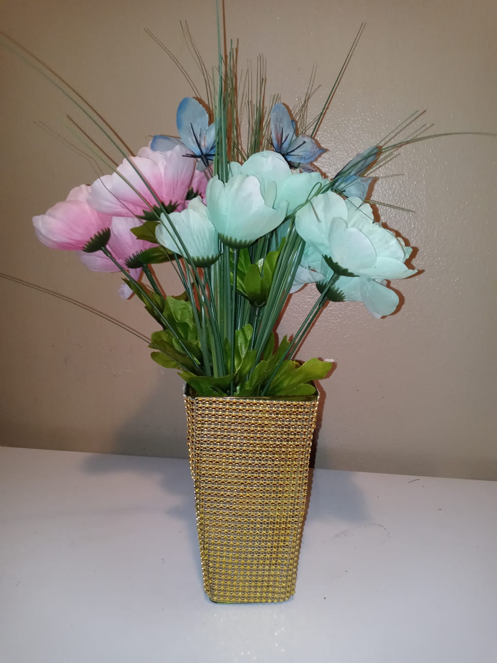 Flowers of hope is one of my best projects as a creative so far because it has given me a metaphor of love & life which I never got from my previous works. Although I loved to create jewelry, dresses & paintings I never had a personal connection to my projects or hobbies. When I would be alone in my creative space I would just grab some jewelry wires & charms to make a cool pair of earrings . Maybe grab some fabrics from my bin & sew a pretty dress. Or I would get a blank canvas & let the vibrant colors speak for me. During the pandemic last year my family got some shocking news my aunt was diagnosed with breast cancer. I watched my aunt go from a vibrant active woman to being scared that she wouldn't be alive to watch her children graduate, losing her hair and barely being able to walk or speak. You never know how you handle certain situations until it hits home or happens to someone you love. For the first time I saw my uncle be vulnerable, he was always so strong & barely showed any emotions. To watch him breakdown seeing his lifelong partner be in so much pain was a touching moment. It scared me because it showed me how unpredictable or unfair life can be. One day could be filled with happiness the next day could be filled with fear or uncertainty.Of course I wanted to ask her a million questions, like what stage are you? , when will your treatments be over. I wanted to inspire her spiritually with words of wisdom, courage & strength but I was left speechless. In that moment I became inspired to create the pandemic really put a hold on my creative juices but with her diagnosis I became inspired with a new idea flowers of hope. I turned to my tools which were scissors, rhinestone adhesives, artificial flowers & a vase.The rhinestone adhesives represented the sun meaning that even if she felt like she was in a dark place there would be light at the end. The green flowers represented me wishing her good health & rejuvenation after the storm is over. The days she would go in for chemotherapy she would have to lay down for hours in complete silence because it made her body so weak .The pink flowers I picked was a way of me speaking to her wishing her happiness & grace along this journey. She doesn't smile as much like she use too but when its over I cant wait to see her be happy again laughing without a care in the world.