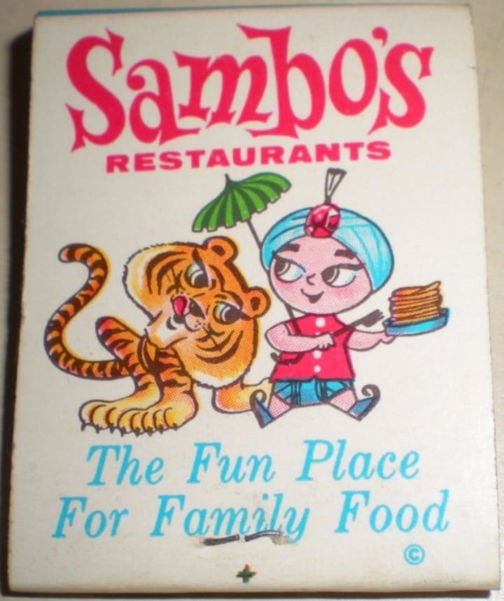Those of you who don't remember Sambo's might be interested to learn about it. Sambo's was a pancake house chain with the theme of the children's story Little Black Sambo. The sign outside showed a little boy in a turban holding a parasol and smiling at a hungry tiger.