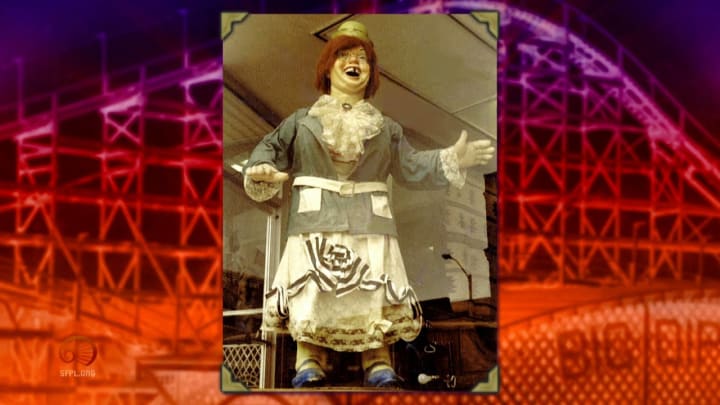 I felt awed and somewhat frightened by the Laughing Woman, with her fat, rosy-cheeked, big-mouthed face and wild gestures. She was in a glass case at the entrance to the Fun House.