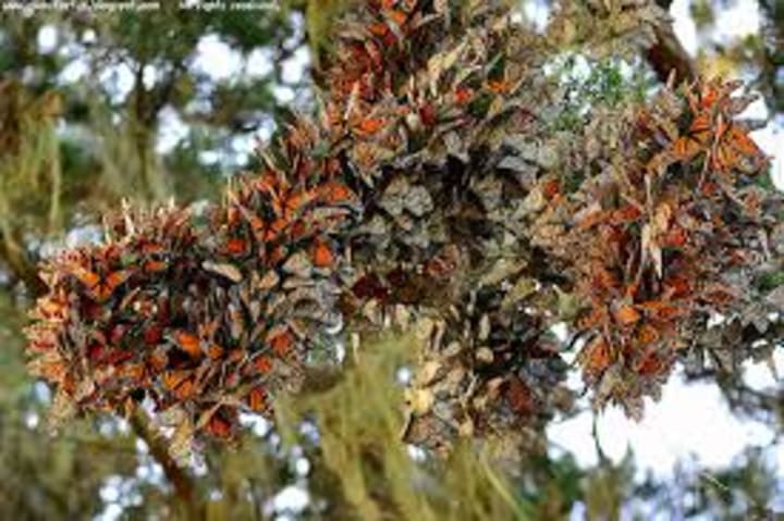 The butterflies literally cover the pine, cypress, and eucalyptus trees. They stay put because they are unable to fly when the temperature is more than 55 degrees Fahrenheit. Their brown folded wings look like dead leaves.