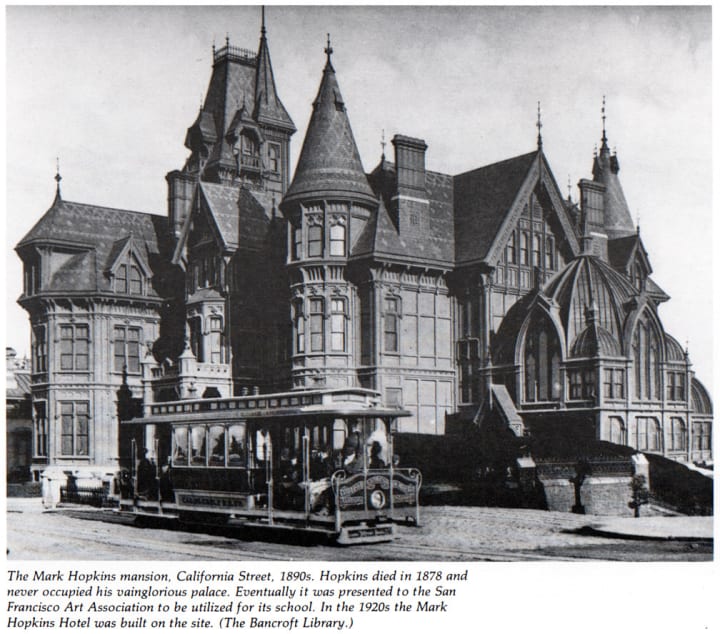 Formerly known as California Hill, Nob Hill became an enclave for rich and famous men. The "big four" Central Pacific Railroad tycoons, Leland Stanford, Collis Potter Huntington, Mark Hopkins, and Charles Crocker built mansions there in the late 19th century. The men were dubbed the "Nobs," hence the hill's name.