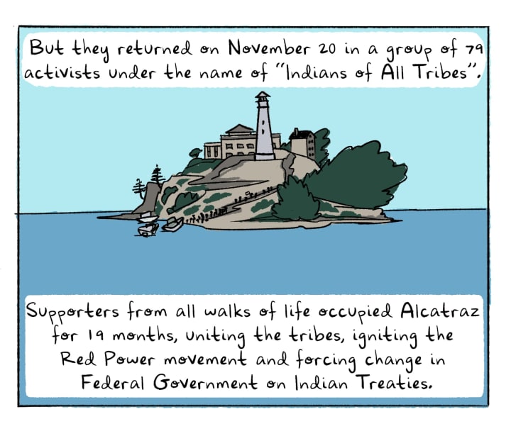 The Native American movement for rights began in San Francisco Bay in 1969 when a group called Indians of All Tribes (IOTA) sailed wooden boats to Alcatraz. They occupied the island for a month demanding that Alcatraz be returned to them.