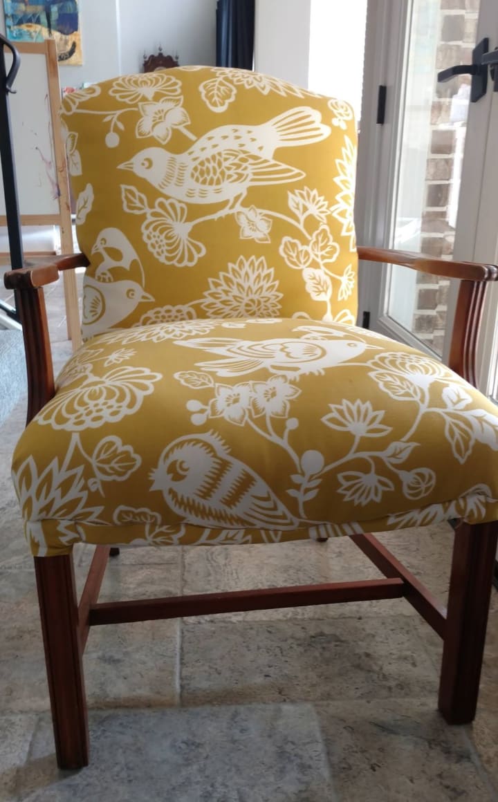I tried to spoil you as well, but you always turned it back on me. Remember that antique chair you asked me to reupholster? How I found the perfect fabric, so you, all yellow and cheer and covered in birds. I fixed that chair, made it as perfect as I could, and then discovered you weren't going to take it with you. "A gift for my grandbaby," you insisted. And so the chair has a place of honor in our home. Every time someone sits on it, we remember Mima. And smile.