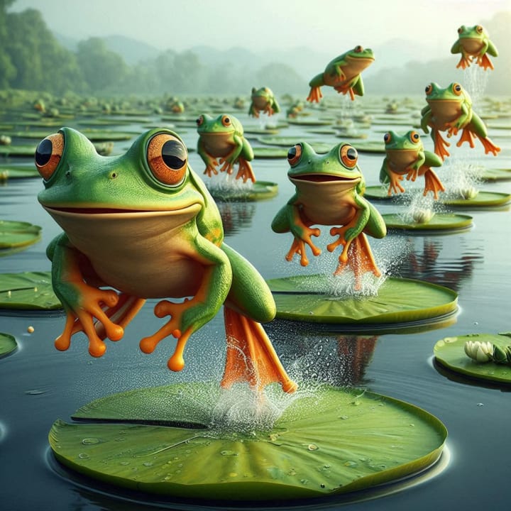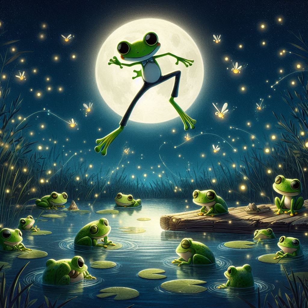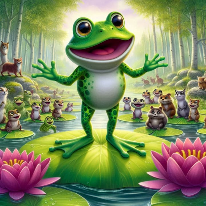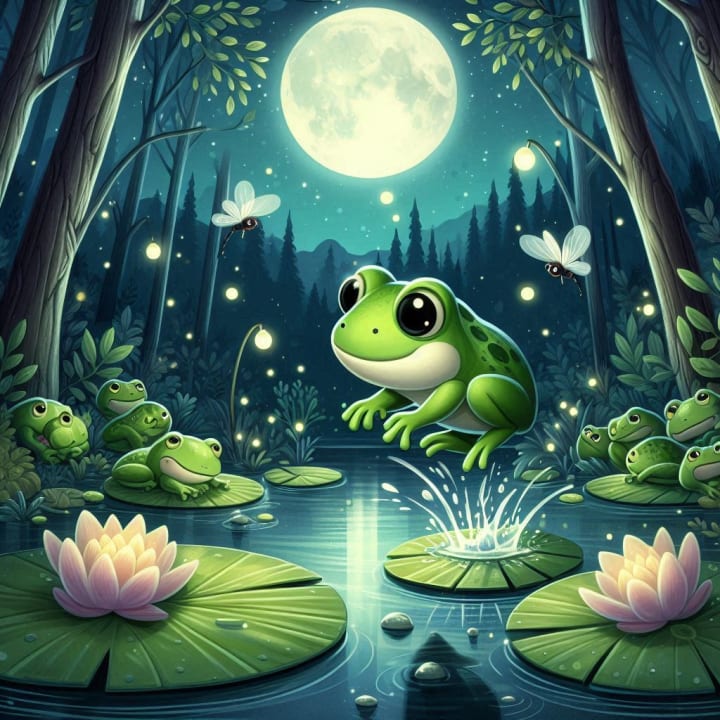 Freddy wasn't just any frog—he was the smallest in his whole pond. While the other frogs could leap across lily pads like champions, Freddy's jumps barely lifted him off the ground. When the bigger frogs sang loud, croaky songs, Freddy's voice was just a squeak. He didn’t have strong legs or a booming ribbit, but what he had was much more powerful—heart. And dreams. Big dreams for such a small frog.