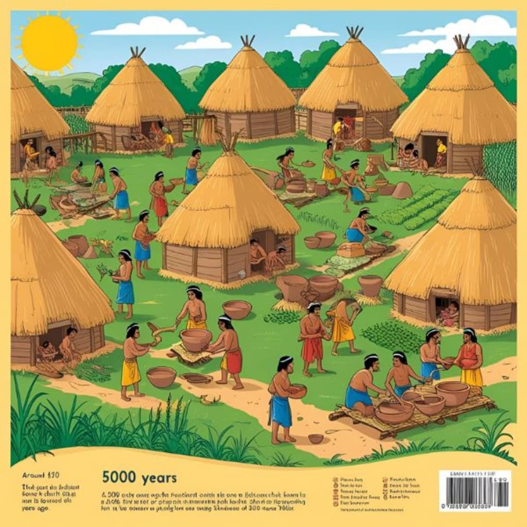 About life around 5,000 years ago (circa 3000 BCE), covering different regions and themes including early civilizations, technology, culture, and daily life.