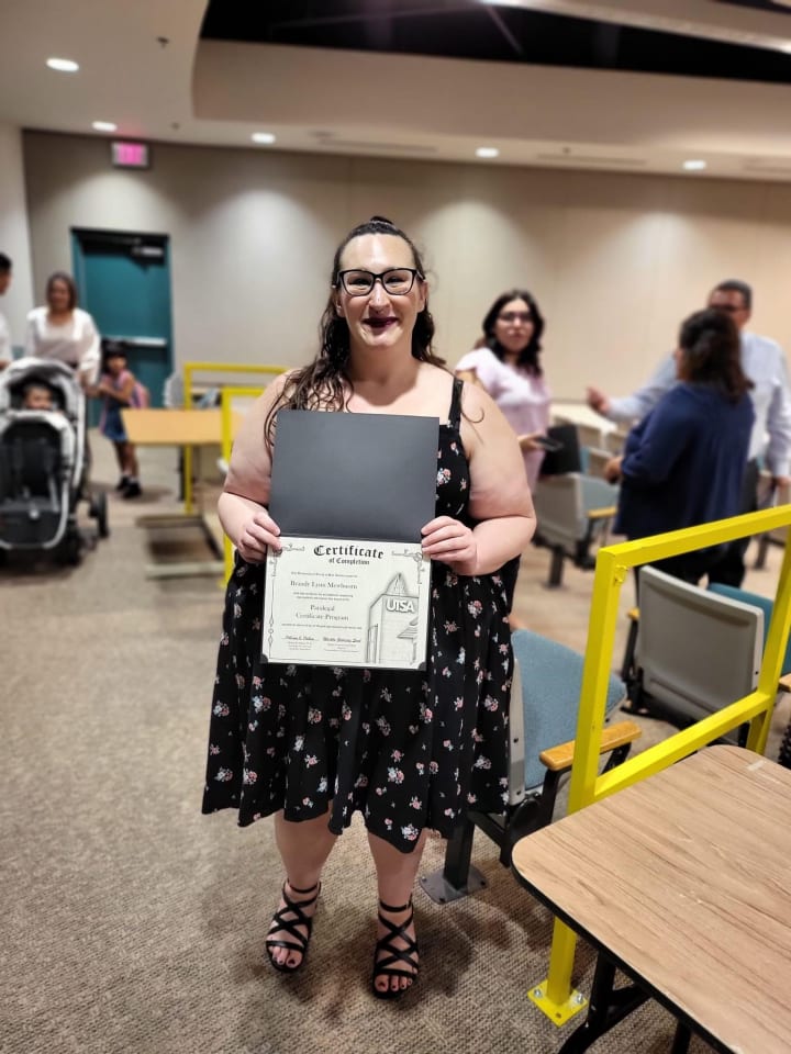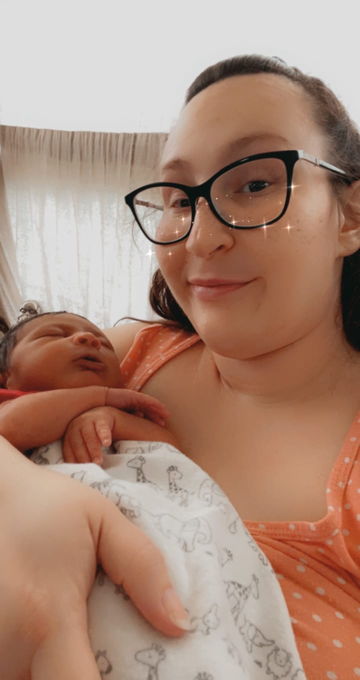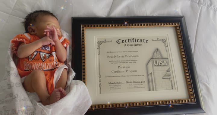At 30, in the fall of 2021, I started a 10 month certification program at UTSA to be become a paralegal to be completed on August 20th, 2022. As my 31st birthday was coming up in a few months at the beginning of 2022, my partner at the time and I decided that we wanted to try for a family. Knowing that I had tried in the past without success I was doubtful that it would happen for me once again, but early in January of this year I was sick for several days with what I now know is morning sickness. At first I thought I was coming down with something since it was allergy season but then food and smells began to bother me as my sickness intensified. I went to get a covid test initially but couldn’t get one so I went to H‑E‑B for a home pregnancy test. I’ll never forget the moment I seen that second line come up on that test while standing in that bathroom stall, so many emotions all at once, of joy, fear, excitement, and anxiety.