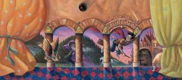 A sandstone colonnade spans a length of dewy, nighttime grass. Both ends are obscured by lush curtains. In the distant twilight, under a lavender sky, stands a hulking castle. An owl with big gold eyes sweeps into the foreground from the left, toward a glittering key. To the right is the boy: in jeans and a gold/red shirt, with a tussle of black hair, round glasses, and of course, the bright red scar, the boy, soaring on his broom, reaches up to catch a tiny brass-colored orb.