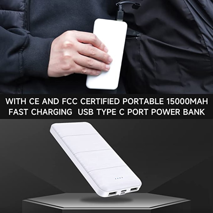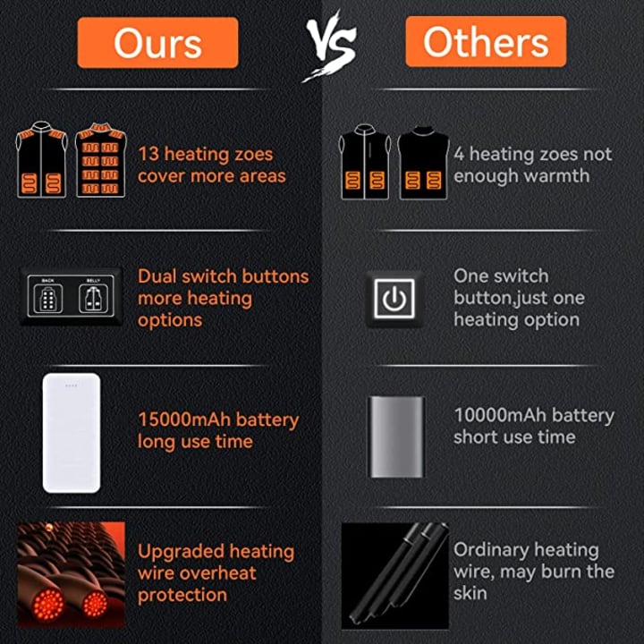 [Safety & Quick & Long-Lasting Warmth]The Electric Heated Jacket with upgraded Lightweight Quick Charge 15000mAh battery pack included. 2 USB ports are added to the power bank for the heated vest with which you can heat your vest and charge your phone at the same time. Our battery pack with built-in safety system can keep your electric heated vest safe from overcurrent, overheating, keeping you warm and safe.