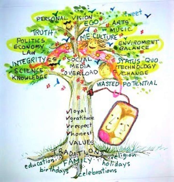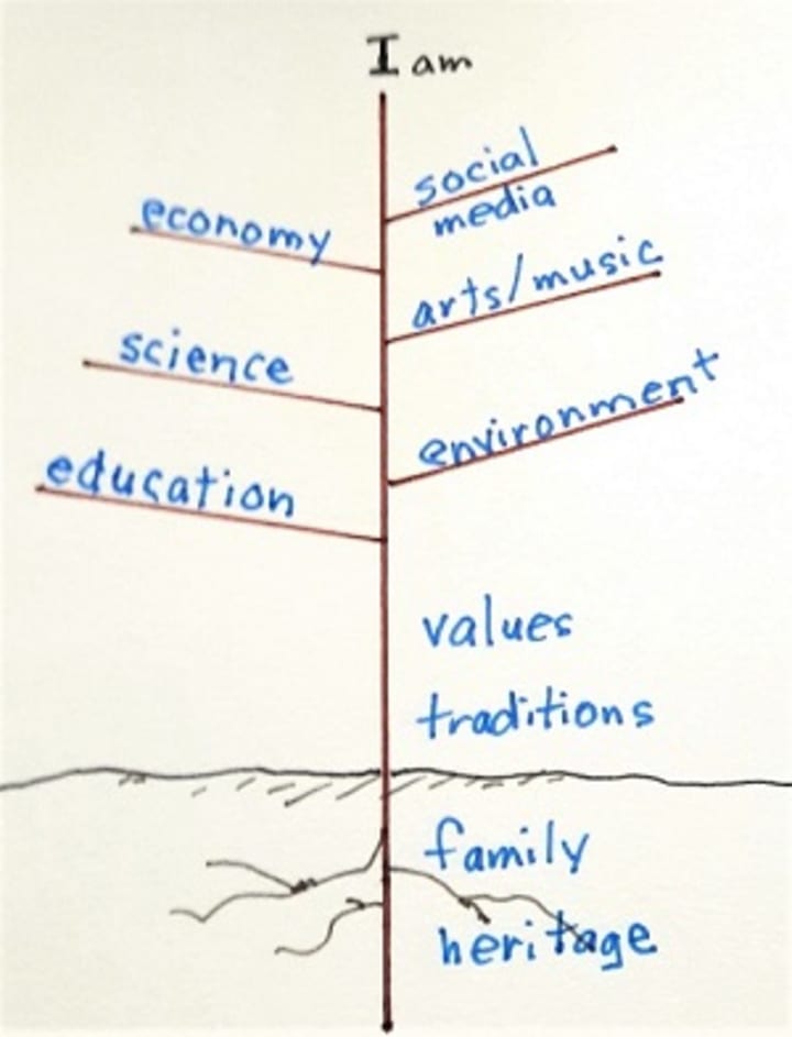 Start with a simple line diagram with given labels: family, traditions, values, Education, Science, Environment, Economy, Arts and Music, Social Media and I (myself) at the top as a culmination of your place in your total culture. Now you can fill in more details that matter to you that are greater asset beyond any Selfie postings.