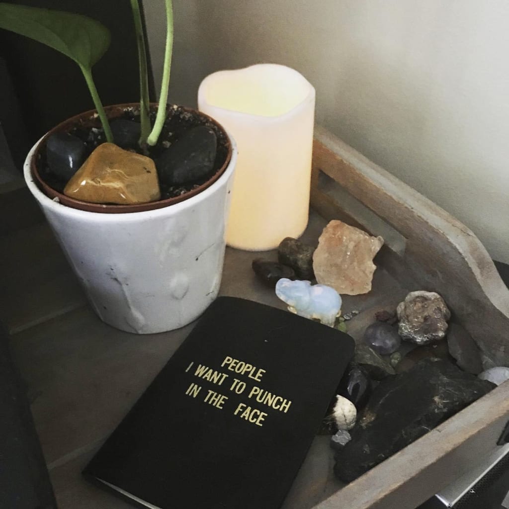I stopped by this quaint little thrift shop near where I live, to my surprise was this little black book with a title that made me laugh out loud so much that when I looked up there were pairs of eyes on me. I smiled back at them to which they smiled back. This tends to happen to me, I am always in my own little world. Now, I am not one to go around punching people in the face, but it resonated because sometimes I read articles or hear things about people that make me livid. I'm a sucker for gold, plus the humorous title written in gold, I couldn't help it. I purchased it and found the perfect spot in my living room. It's humorous, makes me smile every time that I walk by it. But I know in my heart that I will never write anyone’s name in there.