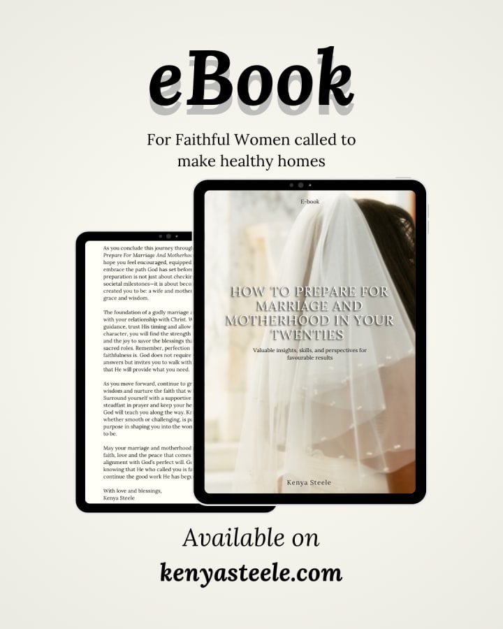 My e-book, How to Prepare for Marriage and Motherhood in Your Twenties, provides women with valuable insights, skills and perspectives to navigate these roles with intention and grace. You can find it on my website: kenyasteele.com