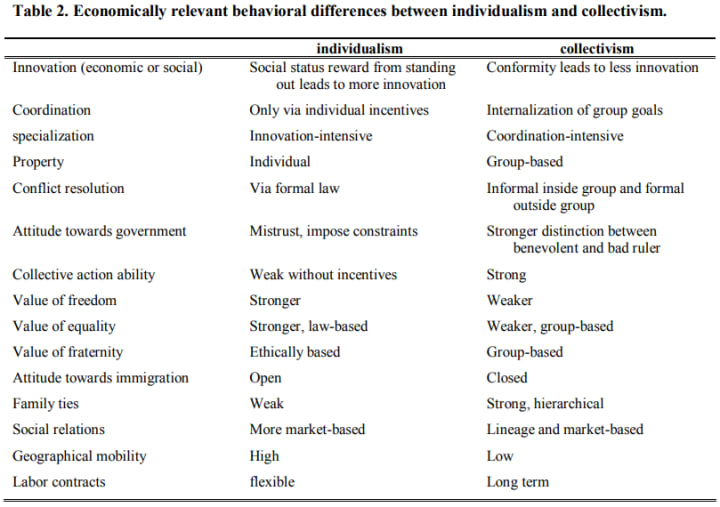 A study by U.C. Berkeley has found the individualism-collectivism cultural dimension to have robust social, economic, and institutional effects. An individual’s behaviour like propensity to save, willingness to contribute to their society, and interest in innovation, which eventually affects the long term growth of a country, depends on their conception of ‘self’.