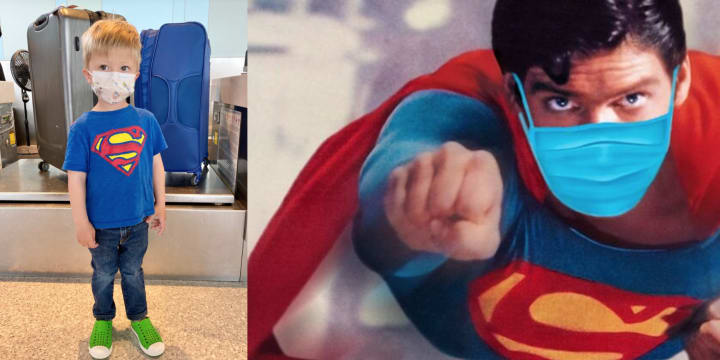 If you do a quick google search, there’s a plethora of cartoon characters and well-known superheroes wearing face masks. If they see their favorite person/character wearing one, then maybe they will want to do the same! Ames is a fan of superman—so when we found a picture of superman wearing a mask, he was interested. Ames even wore his superman shirt to the airport so he could copy him!