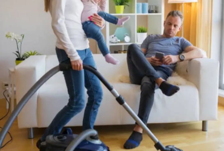 If you aren’t helping her to some degree, that’s a message to her that you don’t care. If one person is a stay-at-home spouse, and the other works full time, it might not be 50–50 regarding household chores and duties. But at least be decent enough to help in a proportional way.