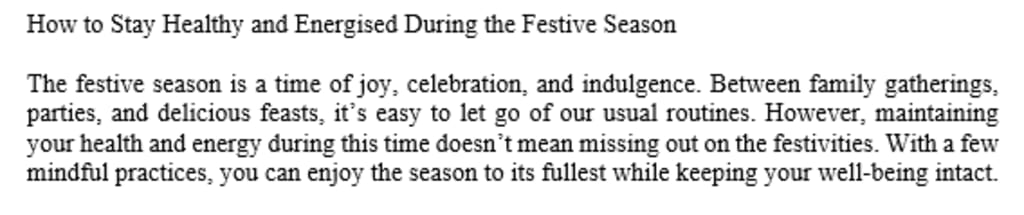 Staying healthy and energised during the festive season is about balance and mindfulness. By making small, thoughtful choices, you can fully immerse yourself in the celebrations without compromising your well-being.