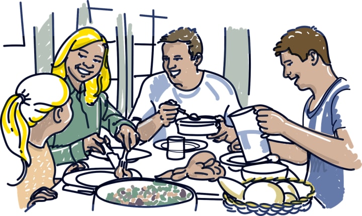 You can even start a small tradition. If you do choose to cook a family dinner on a given night, see if you can split up the responsibilities so that one of you cooks and one cleans up. Then you can have a shared meal, whether or not there is a huge discussion going on.