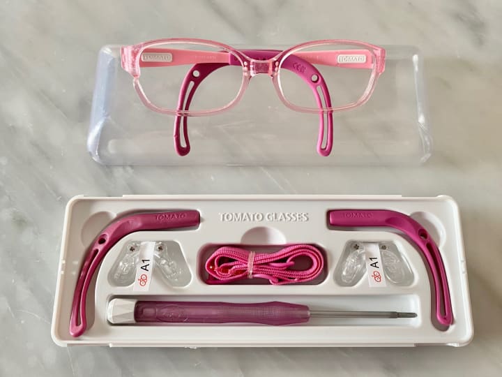 Of course, the fit of glasses really falls on the expertise of the optical store but talk with them on sight to ensure your child has the proper fit. When Joules was first getting fitted for her glasses, we took her in person to a local pediatric optical store that was recommended by her eye doctor. At this store, they measured her face and she got to try on several different types of frames. We wanted to make sure her small nose and ears were comfortable, so we chose glasses that had rubber sides to go over the ears and optional nose pads. There are also straps that can be applied onto the glasses (kind of like the straps on goggles) to keep glasses in place. Although we never used this, it’s an option that came with her glasses kit. Her glasses are made by the Tomato brand and can be seen in the photo below.
