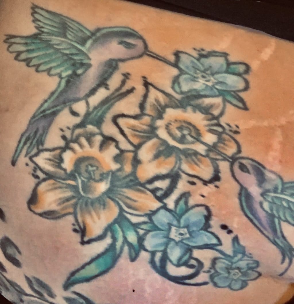 Surrounding the hummingbirds and daffodils are forget- me -nots... those are pretty self explanatory. I miss him so much it makes me sick if I think about it too long.