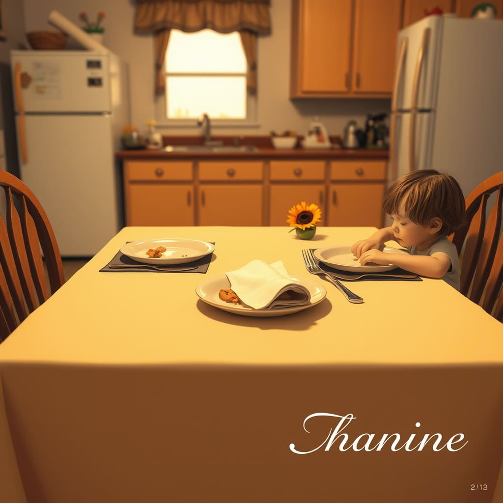 One night, she set the table herself. It was messy – forks upside down, napkins crumpled – but there were three plates.