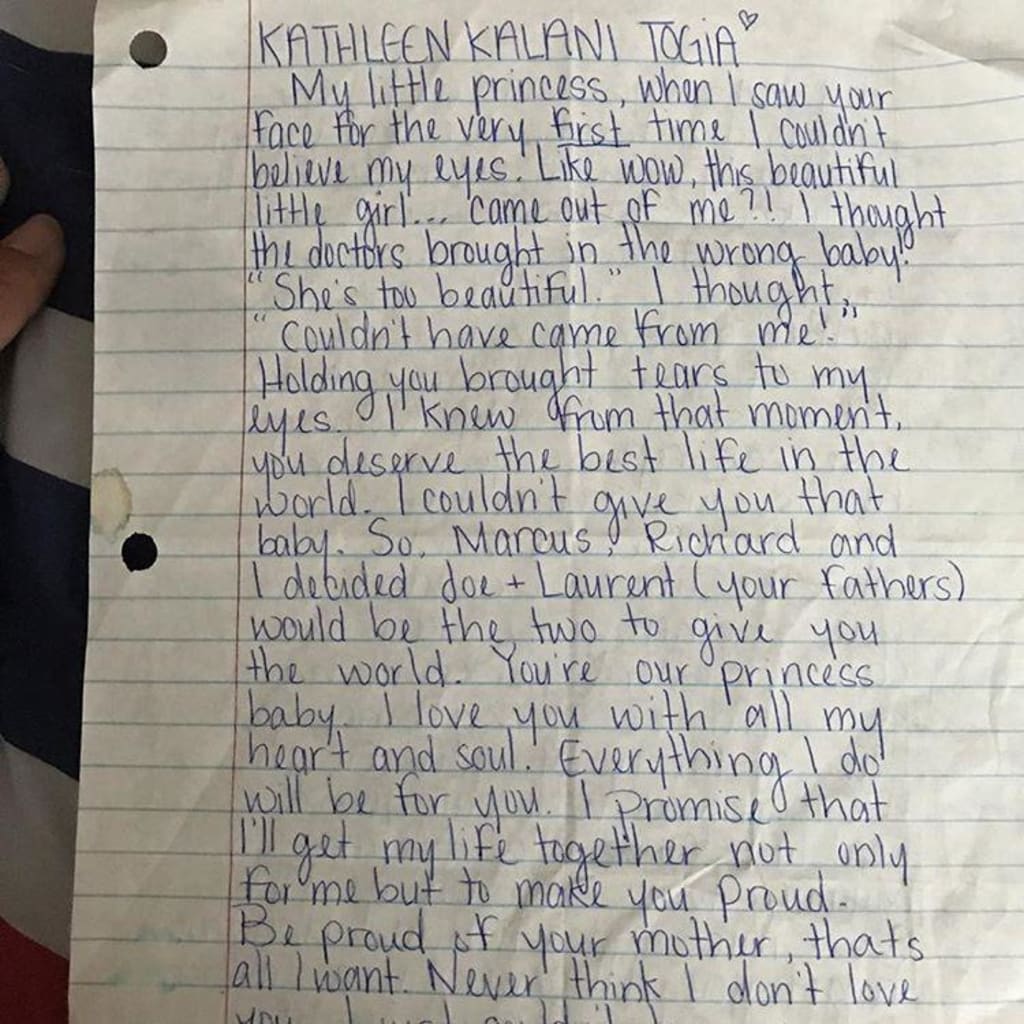 My full name is Mele Kalani Togia-Taito, born 12/08/1997 at 4:45 AM at Kiaser Perminente in San Francisco, CA. My favorite colors are purple and royal blue; purple is also your grandmother's favorite color as well. Her name is Teuila Recardo Togia (her middle name is the same as her father's). I also have a bunch of siblings, a.k.a. your knuckle-headed aunts and uncles—there's Tamaese, Royal, Jayson, Nathaniel, Josiah, and Ezekiel; those are your uncles. Believe it or not, you're older than three of them! Royal, Josiah, and Ezekiel. Then there are your crazy aunties—Silauniu, Ruta, and Juliana. My mother only gave birth to Tamaese, Royal, Silauniu, and myself, of course, and my father (Jayson Will Taito) had the rest on his own. Your mommy here is the oldest; but also the shortest.
